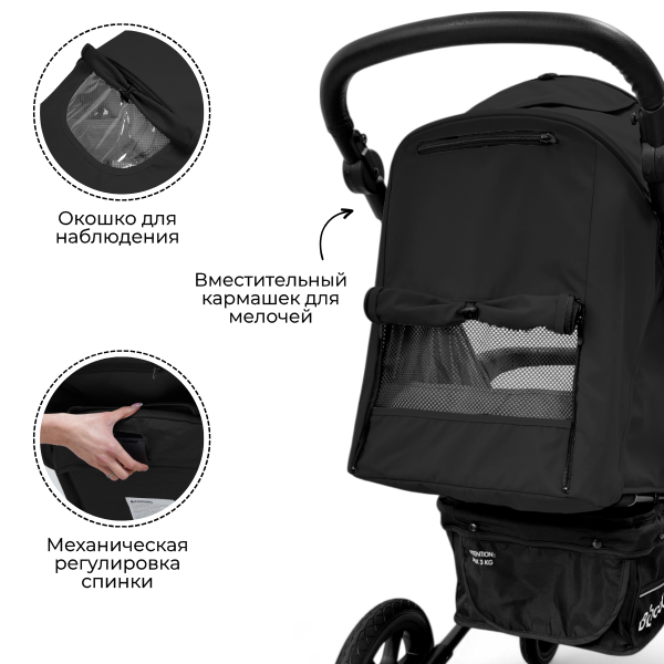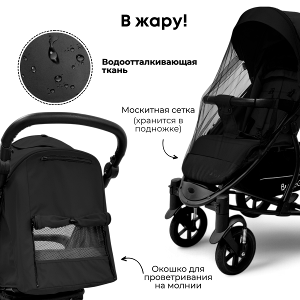 Регулируемая ручка с накладкой из эко-кожи помогает подстроить коляску под любой рост. Задняя стенка коляски полностью открывается для проветривания, а встроенная в нее москитная сетка помогает циркулировать воздуху.