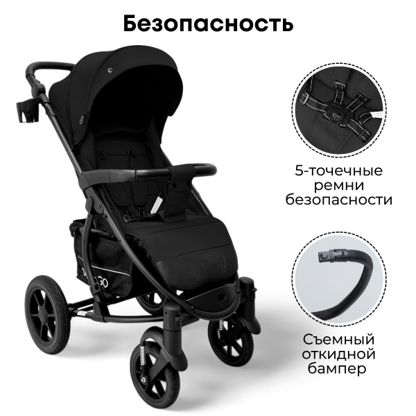 В качестве системы безопасности в ней используются пятиточечные ремни, для надежной фиксации ребенка, съемный защитный бампер с эко-кожей, механизм против сползания, педаль-тормоз на задние колеса, а также световозвращающие элементы на капоре, подножке, чехле для ножек, корзине для покупок и даже на ремнях безопасности.