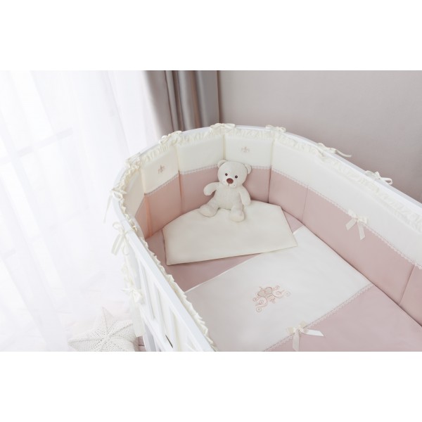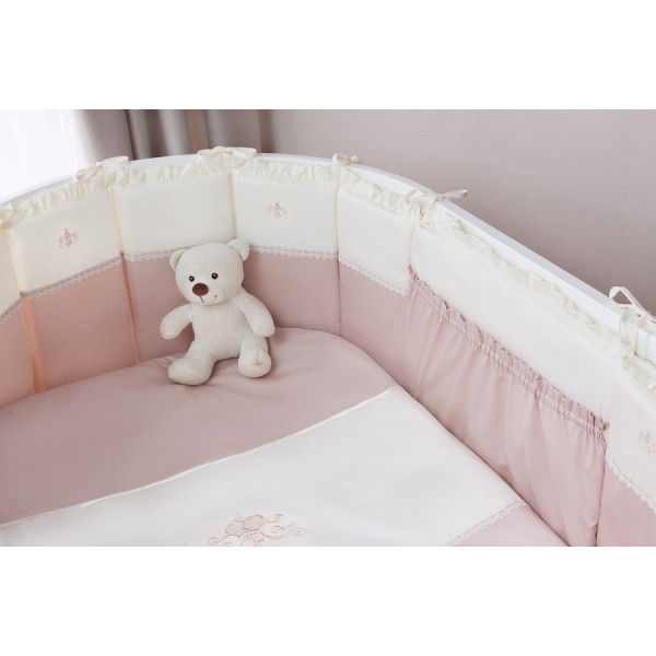 Две простыни разных размеров и составной бампер, допускающий варианты сочетания частей, позволяют использовать комплект в кровати-трансформере. Специально для круглых и овальных кроваток разработана эксклюзивная закругленная форма подушки и одеяла. К комплекту подходит балдахин PerinaЭстель.